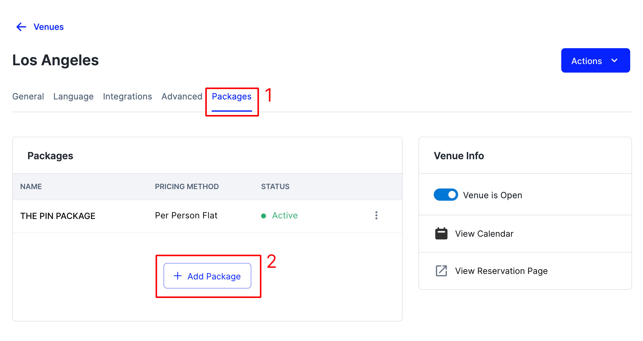 Start by navigating to your REX dashboard. Go to Venues > Select the Specific Venue you wish to add a package to (example: Los Angeles)
