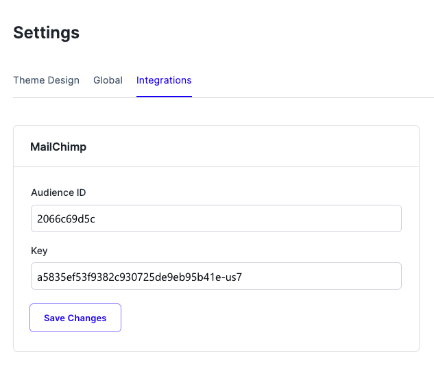 Find the box titled "Mailchimp." Paste the Audience ID and API Key into the text fields and click Save Changes.